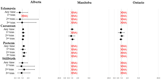 Association between COVID-19 infection and maternal, pregnancy, and neonatal outcomes during pregnancy and by trimester in Alberta, Manitoba, and Ontario. Adjusted for maternal age, maternal comorbidities in the year prior to the 1DG (11 independent variables considered dichotomously and independently: hypertension, respiratory disease, diabetes type 1 or 2, obesity, chronic kidney disease, HIV, use of immunosuppressant, cancer, mood and anxiety disorders, other mental disorder, common rheumatic diseases) and in the 2 years prior to the 1DG (prior history of gestational diabetes, prior history of hypertensive disorders, prior SGA newborns, prior infants with major congenital malformation). NA, not applicable because we have no outcome data, or the cell sizes are small and thus no access to them.