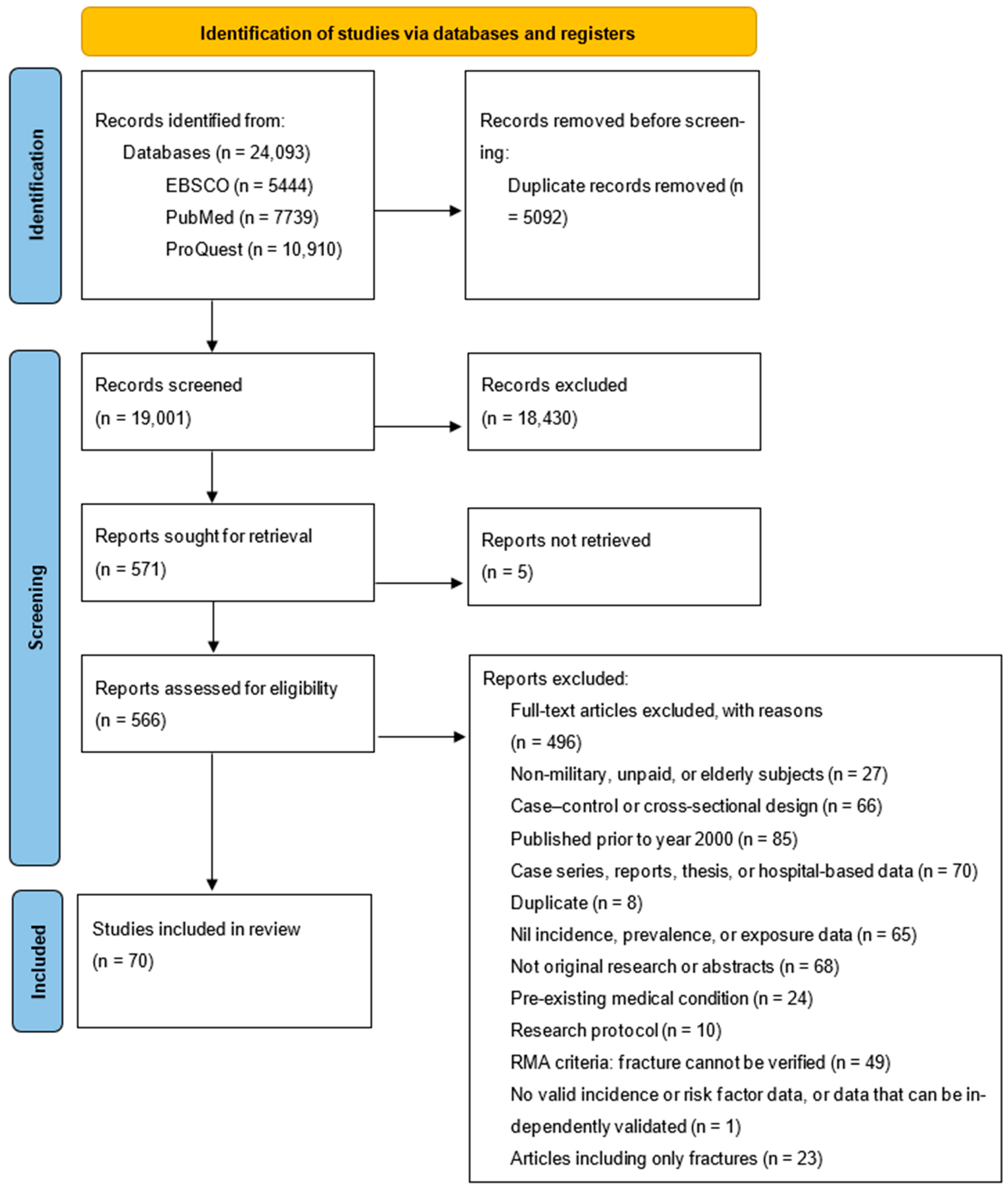 | Studies investigating factors, or exposures, or hazards, or causes, or mediators associated with development or prevention of stress fractures in personnel engaged in military occupations, or the incidence, or prevalence, or likelihood of the condition occurring in military occupational groups; and | Non-peer-reviewed articles and reports; Articles that are not reports of original research; |