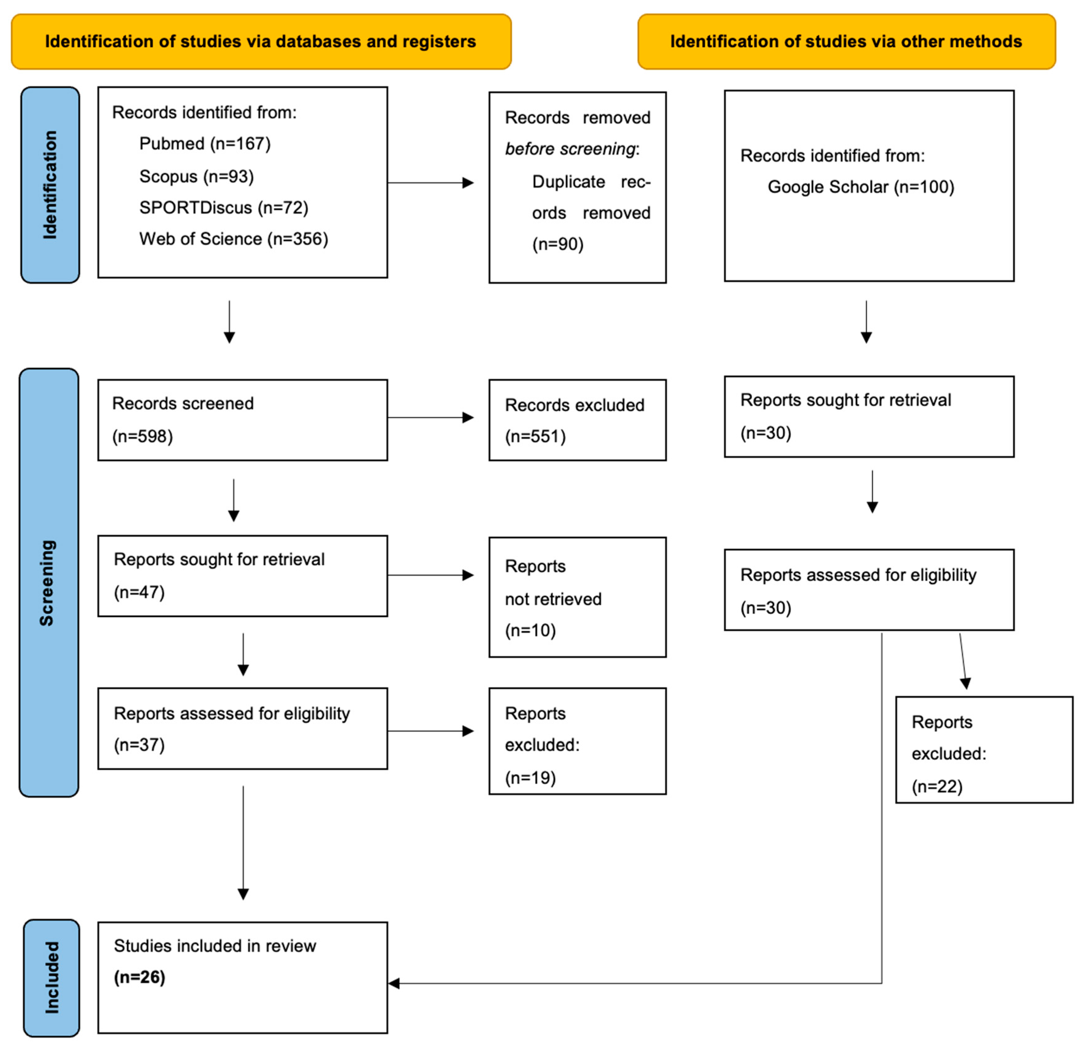 This review draws on a detailed, comprehensive search of four databases (PubMed, Scopus, SPORTDiscus and Web of Science) that was conducted between the dates of 30 August to 15 September 2025, using the search terms listed in Table 1. A gray literature search on Google was also conducted. Search strings were modified for each database, using Boolean operators to combine terms.