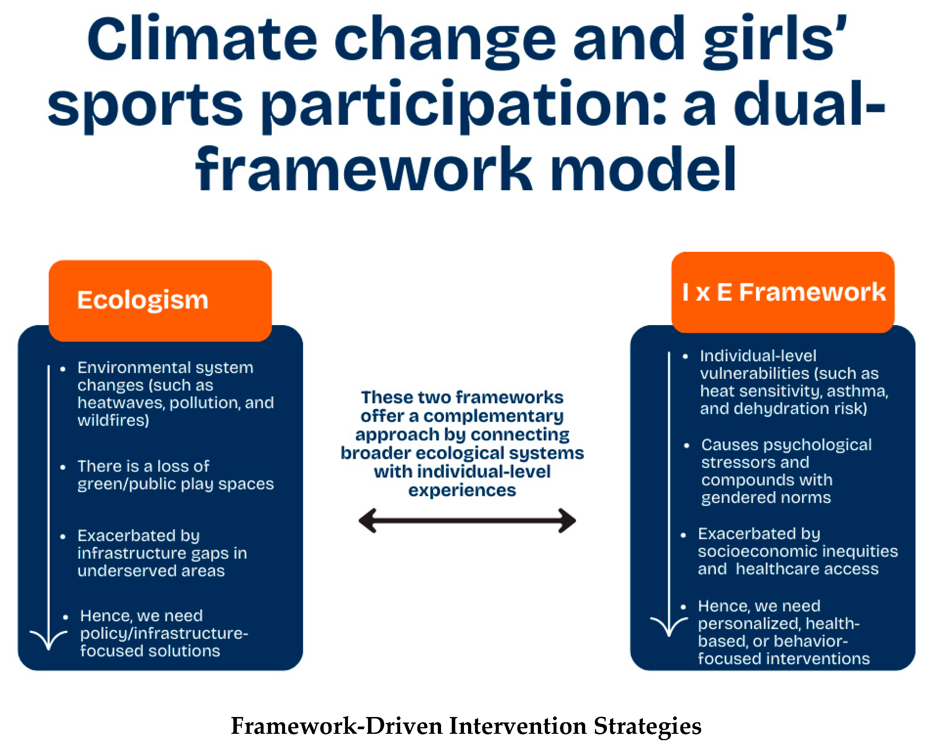 While considerable attention has been given to the health risks associated with climate change, the specific intersection between climate change and adolescent girls’ sport participation remains underexplored. Adolescent girls face distinct physiological vulnerabilities (e.g., lower sweating efficiency and heightened sensitivity to cold), sociocultural constraints (e.g., discomfort with uniforms and sweating), and institutional disadvantages (e.g., underfunded programs), all of which are likely to be amplified by climate-related disruptions [3,29,31].