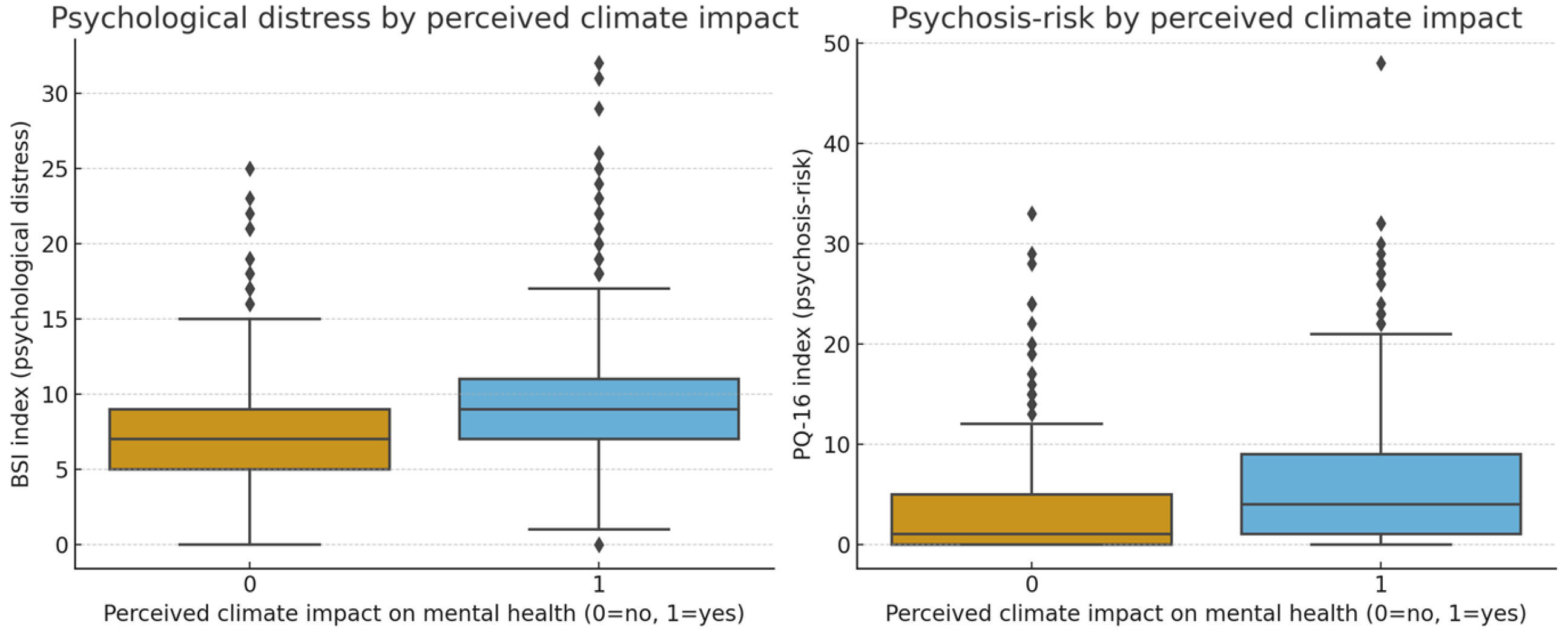 In addition to standardized psychometric scales, our study incorporated self-rated items assessing the perceived impact of climate change on physical and mental health. These variables proved highly informative: nearly two-thirds of the sample endorsed some impact on mental health, and severity ratings correlated robustly with eco-anxiety, general psychological distress, and psychosis-risk indicators. Participants perceiving a climate-related deterioration in their health consistently scored higher on eco-anxiety, BSI, and PQ-16 indices.