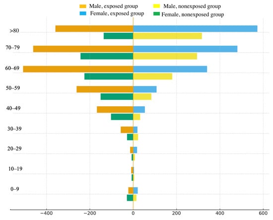 Figure 1 shows a pyramid of mortality rates for the study groups by age and gender. The data are consistent with the results presented in Table 3. In the exposed group, both men and women exhibited higher mortality rates than unexposed individuals in age groups over 30 years. In both study groups, the number of deaths among men in age groups up to 69 years was higher than among women; in the 70–79 age group, these rates were equal; and in groups over 80 years, mortality rates were higher among women.