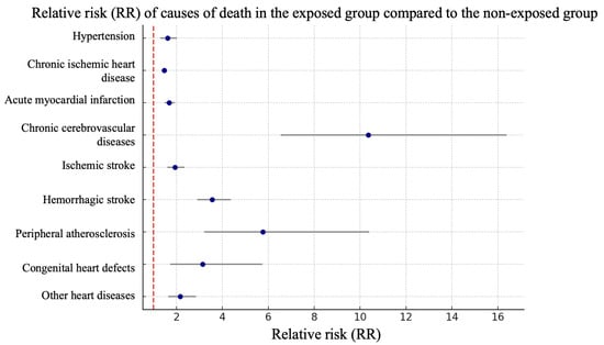 Analysis of relative risks of mortality for individual diseases or groups of diseases demonstrated a statistically significant increase in the exposed group for chronic cerebrovascular diseases—10.35 (95% CI 6.54–16.38), hemorrhagic strokes—3.56 (95% CI 2.9–4.36), peripheral arterial atherosclerosis—5.77 (95% CI 3.2–10.4) and congenital heart disease—3.14 (1.72–5.73). The relative risk for hypertension was 1.61 (95% CI 1.29–2.02), for coronary heart disease—1.46 (95% CI 1.35–1.58) (according to Figure 2).