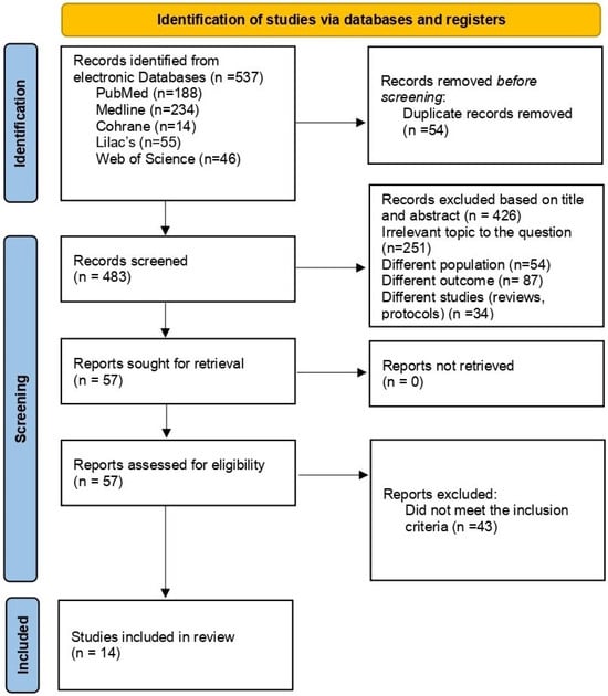 A total of 537 articles were identified, and 54 duplicates were removed during the identification phase. In the screening phase, 426 were excluded after reviewing titles and abstracts, and 43 were excluded for not meeting the inclusion criteria; finally, 14 were selected after a full-text review by the authors (Figure 1). The publications under analysis included 2.518 participants and provided synthesized and described information regarding the relationship between physical activity (PA) and anxiety, as well as test anxiety (Table 1). In total, five studies had test anxiety as the primary outcome, seven had general anxiety as the main outcome, and two considered general anxiety as a secondary outcome (Table 1).