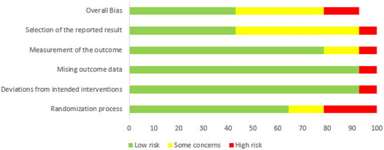 In addition to the above considerations, it is important to highlight the risk of bias analysis, which showed that 21.43% of the articles had a high risk of bias, 35.71% had some concerns, and 42.86% had a low risk. This type of study is prone to biases due to the specific characteristics of each study [,] (Figure 2).