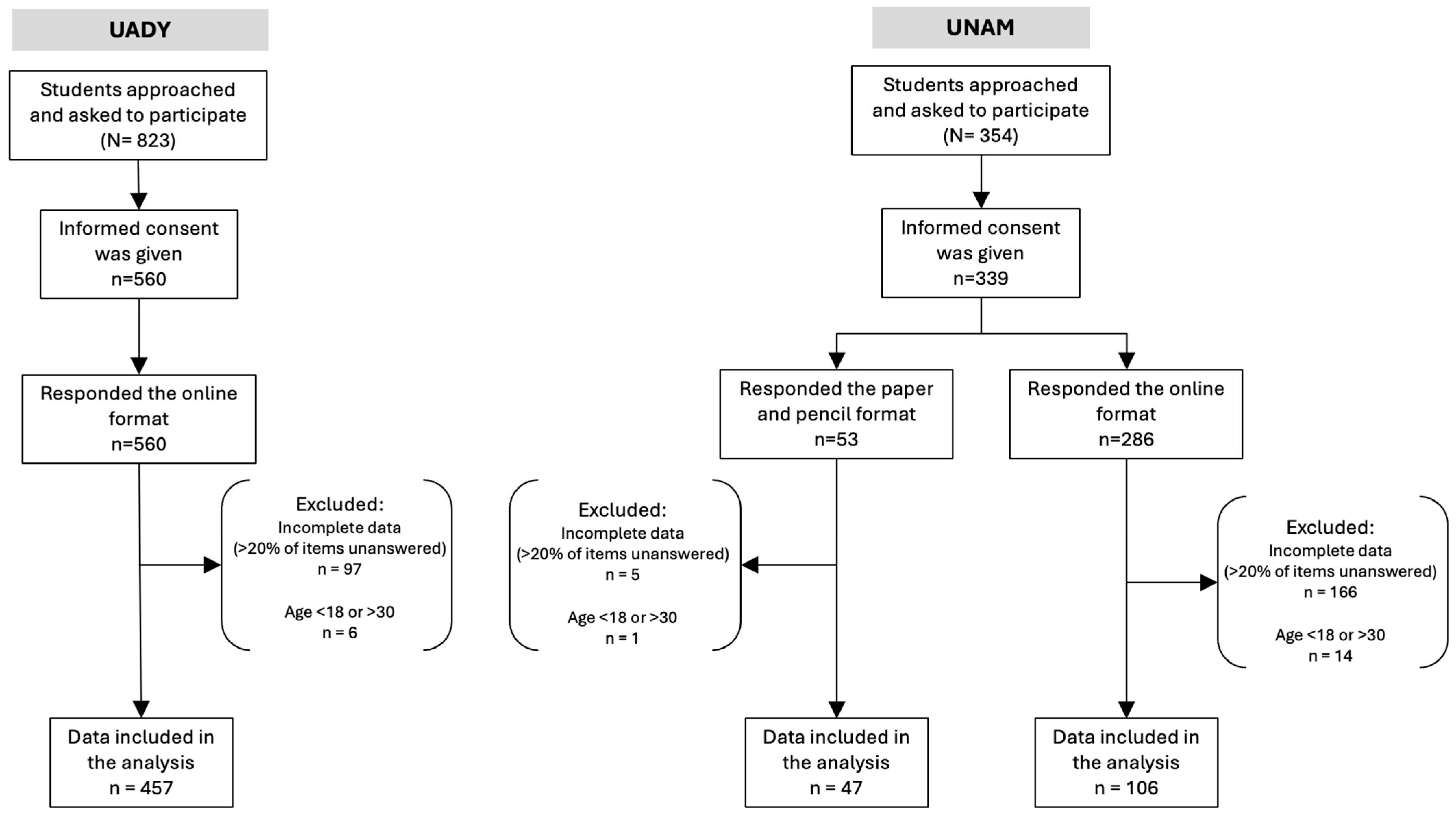 The sample size was calculated using EPIDAT 4.3 with the formula for confidence intervals for a proportion, considering an infinite population for students enrolled at UADY and a finite population for students seeking mental health services at UNAM. A 95% confidence level was used, with a precision of 0.5% for UADY and 1% for UNAM, resulting in a minimum sample of 473 students from UADY and 153 students from UNAM. A non-probabilistic quota sampling method was used because accessing the entire population of students seeking mental health services at UNAM was not feasible, making random selection impossible. Similarly, all UADY students that were approached and agreed to participate were included in the survey and due to the lack of a defined sampling frame this did not allow for probabilistic selection procedure. This strategy maximized participation given the logistical and structural conditions of each university.