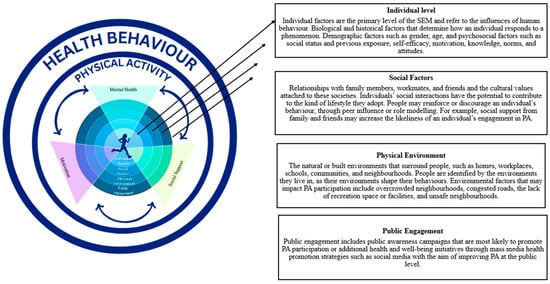 In terms of utilising the SEM for this current study, the adapted ‘Public Engagement’ level highlights the value of actively involving the broader community in promoting PA []. This innovation reflects the modern reality of health promotion, where engagement extends beyond policy and institutional frameworks to include digital platforms, social media, and community-driven initiatives [,]. By incorporating public engagement, the model captures real-world influences on behaviour and differentiates itself from traditional, policy-centric SEM approaches, emphasising the importance of collective participation in sustaining health-promoting practices [].