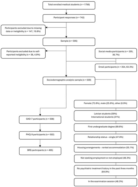 Participant flow diagram illustrating the recruitment, exclusion, and final analytic sample of medical students (n = 559), including subsamples completing the GAD-7, PHQ-9, and BRS.