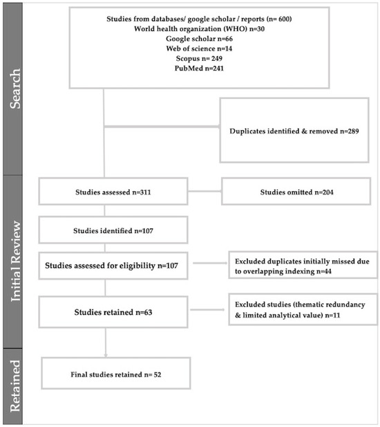 The initial search across the four selected electronic databases and gray literature sources yielded 600 records. After the first round of duplicate removal, 311 unique records remained for title and abstract screening. During this stage, 204 records were excluded for not meeting the inclusion criteria. A further 44 duplicates, initially missed due to overlapping indexing across databases, were also identified and removed at this point. This left 63 full-text articles for eligibility assessment. Eleven studies were excluded during the data extraction phase due to thematic redundancy and limited analytical value. Finally, 52 studies met the inclusion criteria and were included in the final synthesis. The full study selection process is presented in the PRISMA-ScR flow diagram (Figure 1).