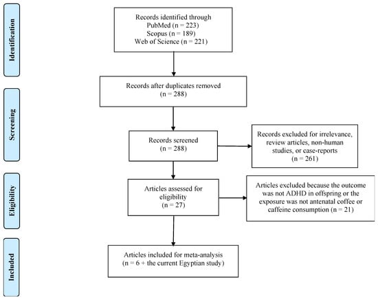 No studies to date have examined the association between maternal coffee consumption and ADHD risk in Egypt or the Middle East. Furthermore, no prior meta-analysis has synthesized the global evidence on this association. We hypothesized that frequent maternal coffee consumption during pregnancy would be associated with an increased risk of ADHD in offspring. Therefore, we conducted a case–control study, using data from Egypt, to examine the association between maternal coffee consumption during pregnancy and ADHD risk in offspring. Then, we integrated the findings of the Egyptian study with existing global evidence through a systematic review and meta-analysis to obtain a more generalizable conclusion.