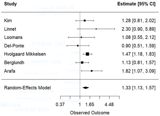 The relative contribution of each study to the pooled meta-analysis was as follows: Kim et al. (11.9%) [], Linnet et al. (3.0%) [], Loomans et al. (5.7%) [], Del-Ponte et al. (7.9%) [], Hvolgaard Mikkelsen et al. (40.8%) [], Berglundh et al. (21.6%) [], and Arafa et al. (9.1%). Only Hvolgaard Mikkelsen et al. [] and Arafa et al. reported statistically significant positive associations between maternal coffee consumption during pregnancy and ADHD in offspring, whereas the remaining studies showed non-significant associations. Overall, the meta-analysis showed a significant association between maternal coffee consumption during pregnancy and ADHD risk in offspring (OR = 1.33; 95% CI: 1.13, 1.57), with no evidence of heterogeneity (τ2 = 0.01, I2 = 8.89%, H2 = 1.10; p = 0.36) (Figure 2).