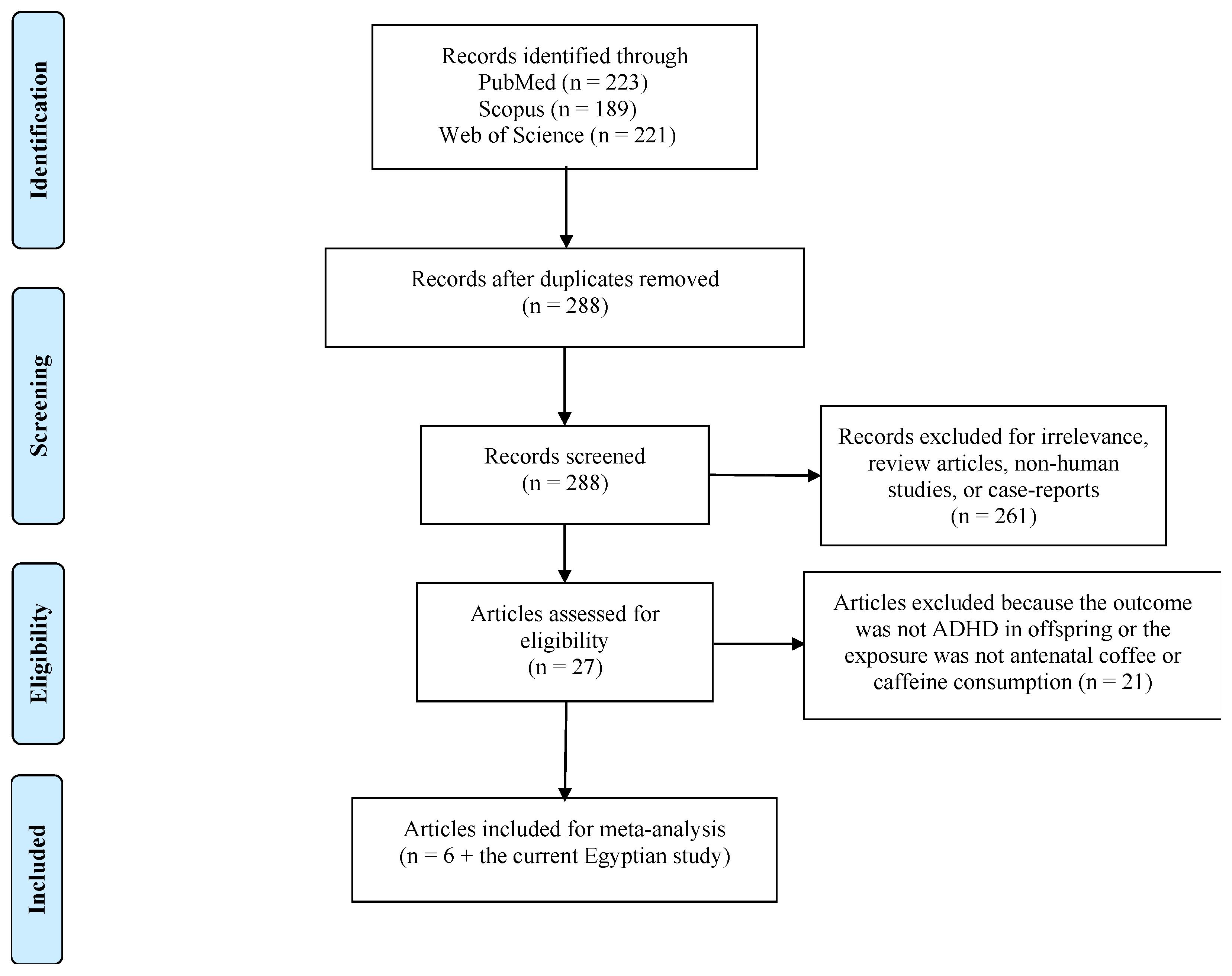 APA StyleArafa, A., Said, A. S. A., Elkady, E., Ali, T. A. Y., & Khalil, D. M. (2025). Maternal Coffee Consumption During Pregnancy and Attention-Deficit/Hyperactivity Disorder in Offspring: A Case–Control Study and Meta-Analysis. International Journal of Environmental Research and Public Health, 22(12), 1808. https://doi.org/10.3390/ijerph22121808