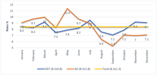 Proportional registration of hospital admissions diagnosed with DDT and AD by months.