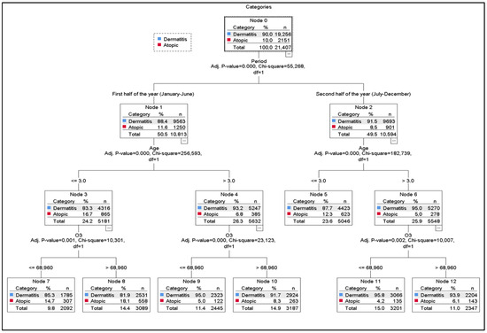 Figure 2 shows that the root node (Node 0) contains 90.0% dermatitis and 10.0% AD cases. The first split is based on the period variable, which is statistically significant (χ2(1) = 55.3, p < 0.001). AD prevalence is higher in the first half of the year (11.6%) and decreases in the second half (8.5%).