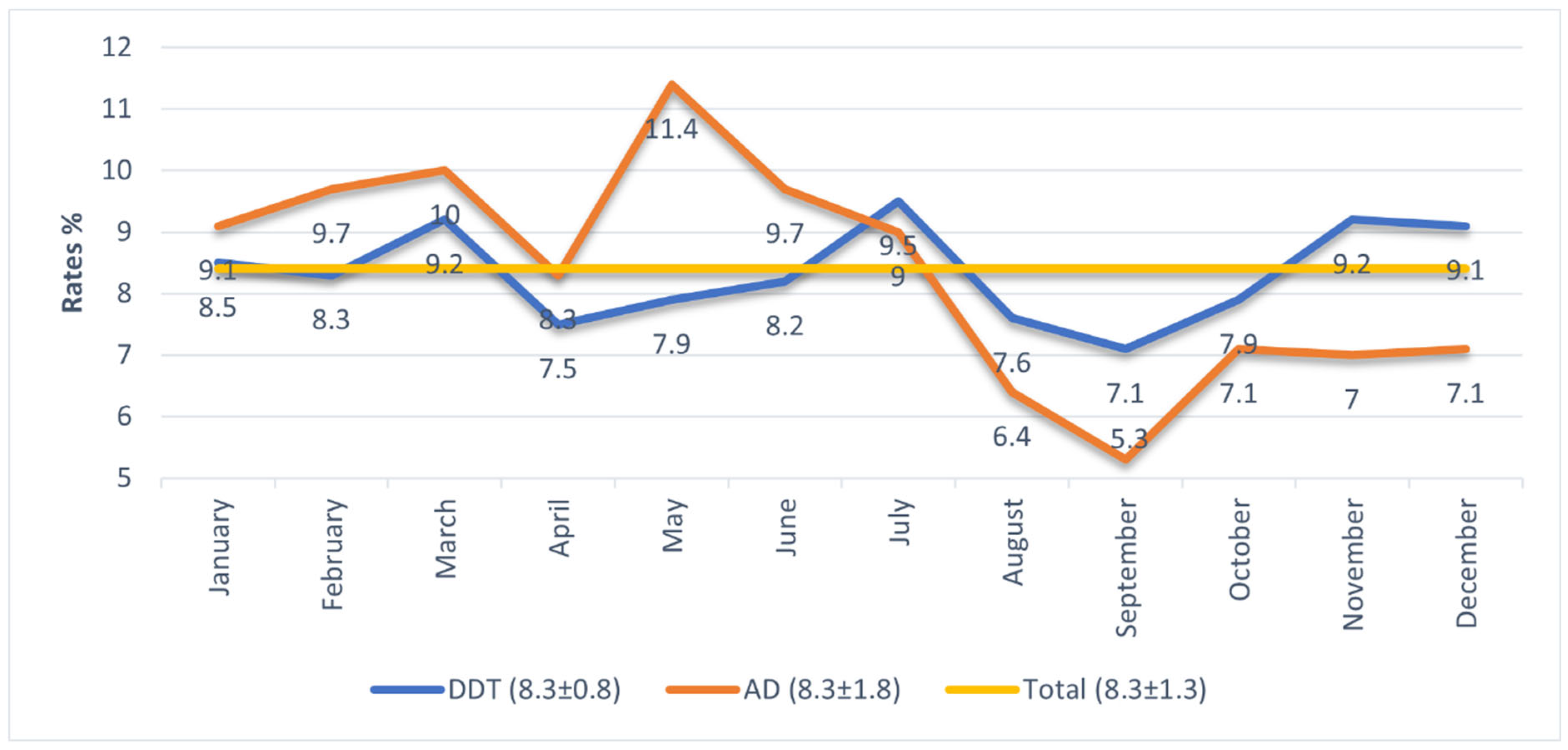- Dermatitis diagnoses outside the DDT and AD categories, since these remaining ICD codes had very low frequencies or represented heterogeneous conditions unsuitable for analytical grouping