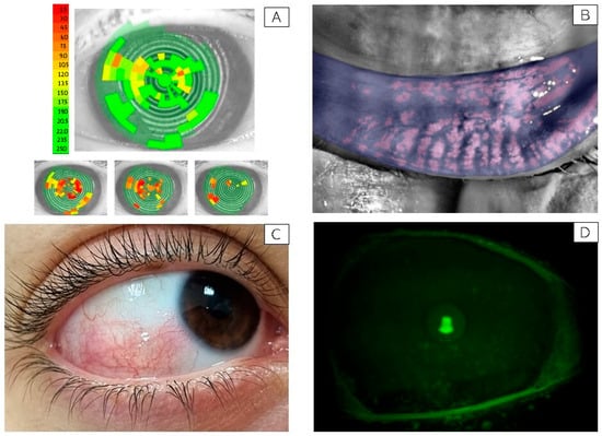 Representative ocular surface alterations observed in study participants. (A) Non-Invasive Break-Up Time (NiBUT) map of a representative subject with tear film instability (NiBUT = 5 s). The map displays the tear film breakup locations over time, color-coded from green (stable) to red (unstable), reflecting the seconds to first breakup after a complete blink. (B) Infrared meibography image showing approximately 50% loss of the meibomian glands in the lower eyelid. Glands are visualized using infrared light and false coloring, allowing evaluation of structural integrity and dropout areas. (C) Clinical image of the right eye from a representative subject with bulbar conjunctival hyperemia graded 3 on the Efron scale [25]. Picture taken with a mobile phone at the original magnification 5×. (D) Slit-lamp image under cobalt blue illumination showing fluorescein staining of the corneal surface in a subject graded NEI score 3 for corneal damage. Green fluorescein dots indicate areas of epithelial disruption [34]. Picture taken with a Topcon slit lamp equipped with a DC-4 camera, original magnification 16×.