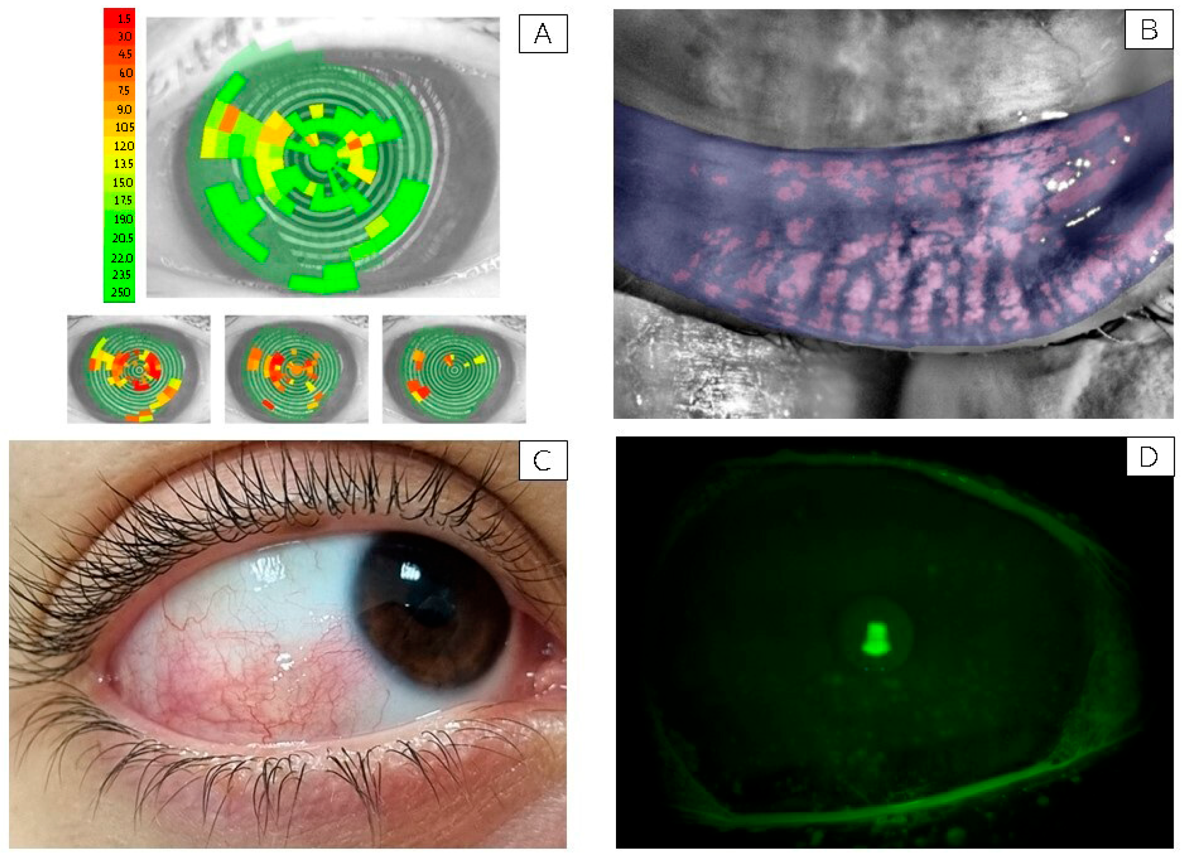 Figure 1. Representative ocular surface alterations observed in study participants. (A) Non-Invasive Break-Up Time (NiBUT) map of a representative subject with tear film instability (NiBUT = 5 s). The map displays the tear film breakup locations over time, color-coded from green (stable) to red (unstable), reflecting the seconds to first breakup after a complete blink. (B) Infrared meibography image showing approximately 50% loss of the meibomian glands in the lower eyelid. Glands are visualized using infrared light and false coloring, allowing evaluation of structural integrity and dropout areas. (C) Clinical image of the right eye from a representative subject with bulbar conjunctival hyperemia graded 3 on the Efron scale [25]. Picture taken with a mobile phone at the original magnification 5×. (D) Slit-lamp image under cobalt blue illumination showing fluorescein staining of the corneal surface in a subject graded NEI score 3 for corneal damage. Green fluorescein dots indicate areas of epithelial disruption [34]. Picture taken with a Topcon slit lamp equipped with a DC-4 camera, original magnification 16×.