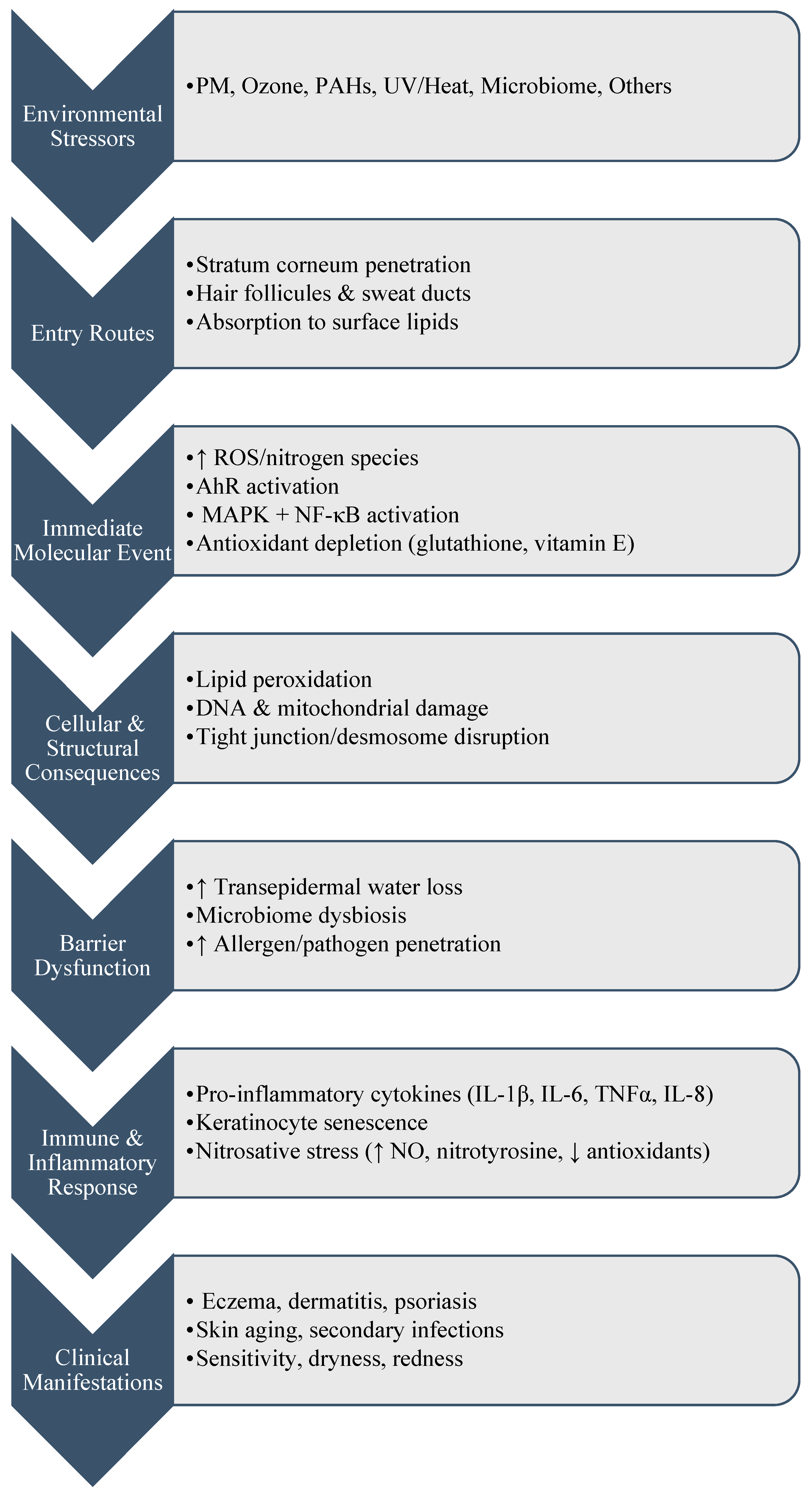 | Micro- and nanoplastics (MNPs) [27,28] | Plastic fragments from environmental degradation of larger plastics or direct industrial/consumer sources; microplastics (<5 mm) and nanoplastics (<1 μm) detected in air, water, food, and human tissues. | Exposure via inhalation, dermal contact, or ingestion; MNPs generate reactive oxygen species (ROS), disrupt epidermal barrier lipids, provoke keratinocyte inflammatory signaling (IL-1, IL-6, TNF), and perturb the skin microbiome. Nanoscales may translocate across compromised epithelia. | Mechanistic evidence suggests potential to impair barrier function and drive cutaneous inflammation, raising concern for contributions to premature skin aging and dermatitis, though direct human evidence remains limited. |