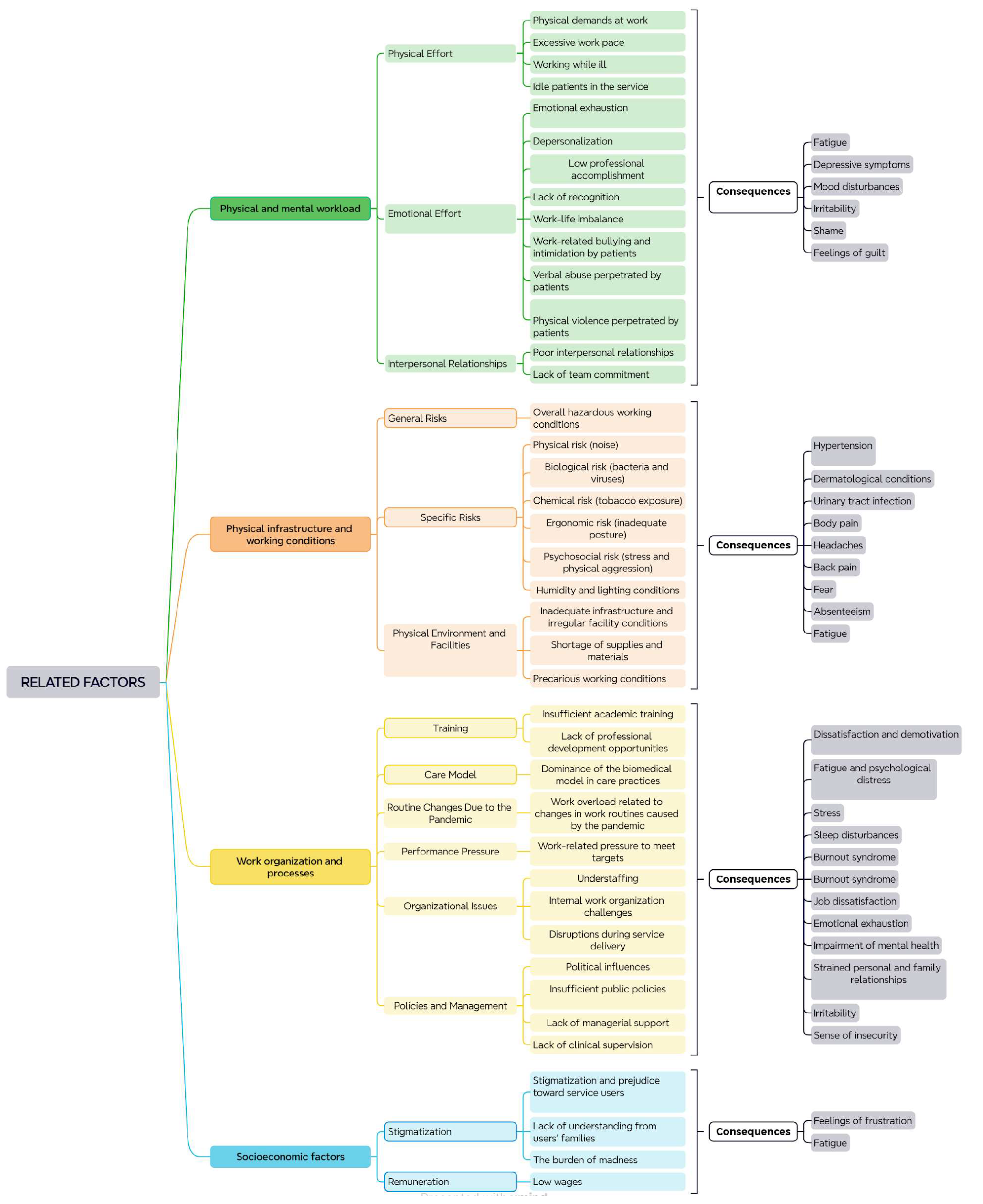 | Pascoal F.F.S. et al. [32] | 2021 Brazil | Mixed-Methods Study | To identify factors causing work overload in a psychiatric complex and assess strategies to mitigate this overload. | Psychiatric Complex in João Pessoa, Paraíba. |