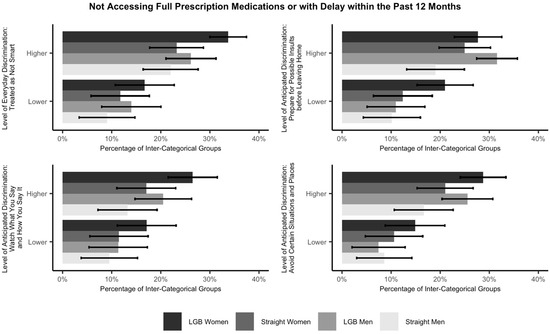 Also echoing existing research, LGB men are least likely to access prescription medications among the inter-categorical groups by interacting sexual orientation and sex, while LGB women and straight women are also less likely to access prescription medications than straight men. Research on prescription medication use for people who have chronic diseases suggests similar results that straight men with chronic diseases are most likely to have filled all prescribed medications in comparison to LGB women and men with chronic diseases [51]. One possible explanation is LGB people’s socioeconomic disadvantages and higher rates of being uninsured for prescription medications [51,52]. The reasons why LGB men are least likely to access prescription medications among the inter-categorical groups by interacting sexual orientation and sex are unclear. Our results suggest that policies can target LGB women, offering more lesbian/bisexual women-affirmative care resources and raising awareness of potential intersectional sex and sexual minority oppressions LGB women have experienced. Regarding prescription medication, policies can target LGB men, LGB women, and straight women, providing training to healthcare professionals to increase their awareness of sexual orientation, gender identity, and discrimination effects on healthcare access inequities.