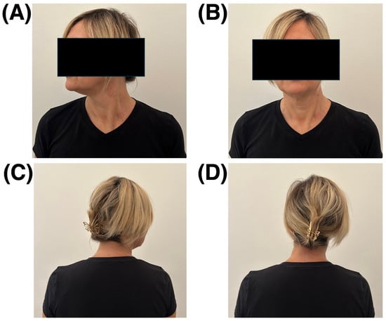 Frontal-plane photographs of the patient’s neck and head: anterior view (A,B) and posterior view (C,D). In panels (A,C), the patient was instructed to keep the muscles relaxed and assume her natural posture. In panels (B,D), she maintained her habitual postural correction attempt. Written permission to publish the photos was obtained from the patient.
