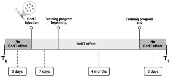 As mentioned, at baseline assessment (T0), approximately four months had elapsed since the patient’s last BoNT injection, thus excluding its effect [15]. The patient subsequently received a new injection between T0 and the start of the training program, which began seven days later. This injection was administered at the same sites and dosages as the last one performed before the patient came to our center. Consequently, the training was performed at least in part during the period of BoNT activity. The post-intervention assessment (T1) was carried out in the absence of the toxin’s effect, as the training program lasted four months [15]. BoNT can only slightly modify gait kinematics during its active period [32]. Hence, conducting both assessments during periods when BoNT is not expected to be active prevents the risk of potential bias. The temporal sequence of events is illustrated in Figure 2.