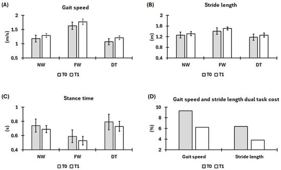 Mean values of (A) gait speed, (B) stride length, and (C) stance time under usual (UW), fast (FW), and dual-task (DT) walking conditions. Panel (D) shows the dual-task cost for gait speed and stride length. Gray columns represent baseline values (T0), while white columns represent post-training values (T1). Black bars indicate standard deviation (SD).