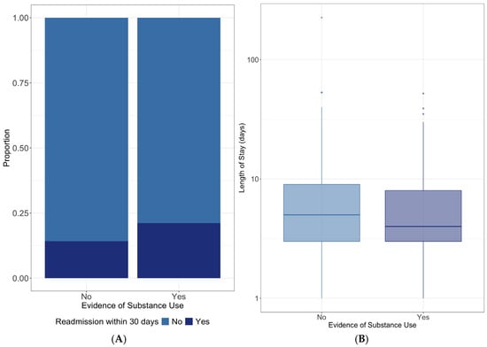 Impact of substance use on 30-day readmission (A) and length of stay (B) among patients with CHF. A shows the proportion of those readmitted (dark blue) and B shows a boxplot of the length of stay in those who did or did not have evidence of substance use. Differences in rates of 30-day readmission were assessed using a Chi-square test (p = 0.048), while differences in length of stay were evaluated using the Wilcoxon rank-sum test (p = 0.04).