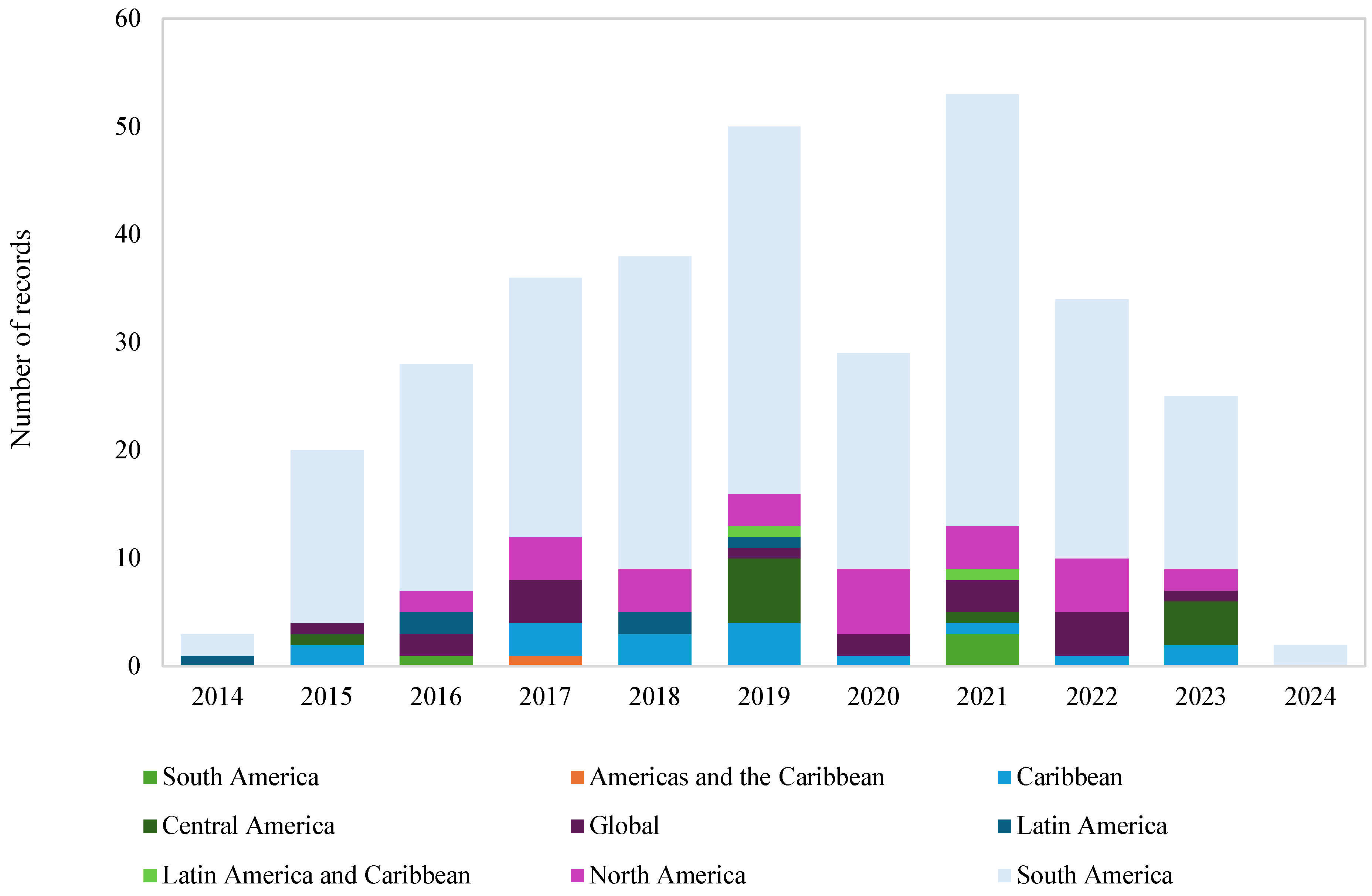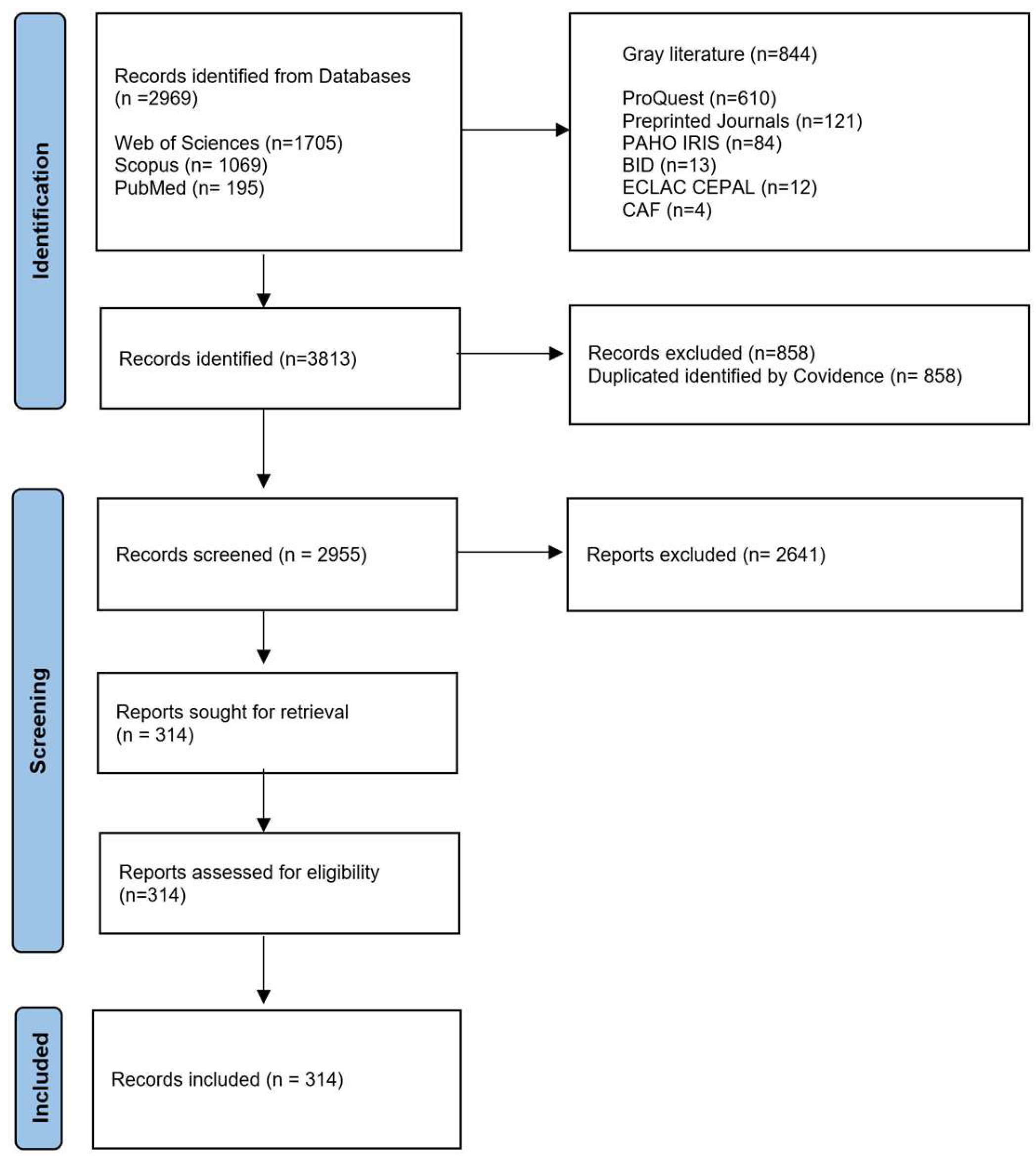 | Search strategy | (“climate-sensitive disease” OR “climate sensitive disease” OR “climate-sensitive infect*” OR “enfermedades sensibles al clima” OR vector-borne OR “mosquito-borne” OR “Aedes aegypti” OR leishmania* OR “Chagas disease” OR trypanosom* OR dengue* OR “yellow fever” OR malaria OR zikv OR zika OR chikungunya OR waterborne OR foodborne OR shigell* OR “Escherichia coli” OR e.coli OR campylobacter OR salmonell* OR typhoid OR amoebiasis OR soilborne OR tuberculosis OR influenza OR rotavirus OR “climate-sensitive diseases” OR pneumococ* OR streptococc* OR varicella-zoster OR measles OR cholera OR norovirus OR helminth* OR meningi* OR tickborne OR Cysticerc*) AND (Economic* OR Cost* OR financ* OR Expenditure* OR “Out of pocket” OR impoverishment OR budget* OR tax* OR burden OR “healthcare spend*” OR wage* OR Salary* OR QALY* OR DALY* OR “resource allocation” OR “Willingness-to-pay” OR monetar* OR productivity OR “Policy evaluation” OR benefit* OR “Years of life lost” OR “value of statistical life” OR adaptat* OR utility OR effectiveness OR efficiency OR gasto OR presupuesto OR impuesto OR AVAC OR eficiencia OR utilidad OR efectividad) AND (climat* OR weather OR “meteorological” OR “atmospheric conditions” OR “Climate change” OR “Extreme weather events” OR Cyclone OR Flood* OR “Heat wave” OR Hurricane OR Storm OR Humidity OR “Soil moisture” OR “la Niña” OR “el Niño” OR ENSO OR “Particulate matter” OR Rain* OR Drought OR Monsoon OR Precipitation OR temperature* OR Wind* OR NDVI OR deforestation OR drought) Subject Not Contain: Communicable Diseases × Subject Not Contain: Comité Ejecutivo de la OPS × Subject Not Contain: PAHO Directing Council × Subject Not Contain: Consejo Directivo de la OPS × Subject Not Contain: Fiebre Aftosa × Subject Not Contain: COVID-19 × Subject Not Contain: Salud Pública Veterinaria × Subject Not Contain: Laboratorios × Date issued: [2015 TO 2023] × Subject Not Contain: Salud Mental × Subject Not Contain: CD54 × Subject Not Contain: Cooperación Internacional × Subject Not Contain: CD58 × Subject Not Contain: VIH × Author: Pan American Health Organization × Subject Not Contain: Cooperación Técnica × Subject Not Contain: SARS-CoV-2 × Subject Not Contain: CSP29 |