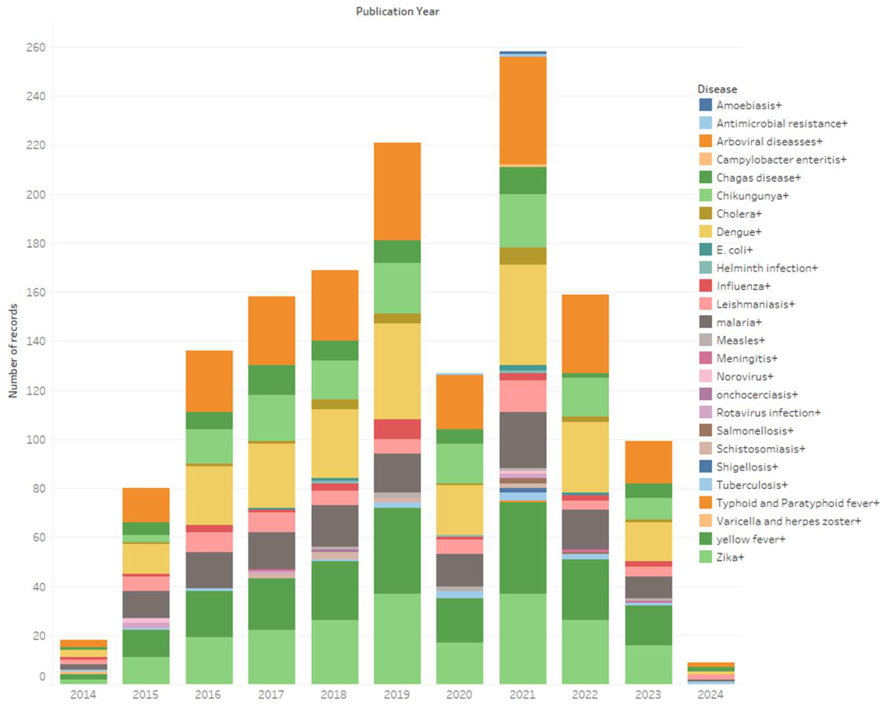 | Search strategy | (((((“vector borne”[Title/Abstract] OR “vector transmission”[Title/Abstract] OR “mosquito-borne”[Title/Abstract] OR “Aedes aegypti”[Title/Abstract] OR aedes[Title/Abstract] OR leishmania*[Title/Abstract] OR “Chagas disease”[Title/Abstract] OR trypanosom*[Title/Abstract] OR chagas[Title/Abstract] OR dengue*[Title/Abstract] OR “Breakbone Fever”[Title/Abstract] OR “yellow fever*”[Title/Abstract] OR “fiebre amarilla”[Title/Abstract] OR malaria[Title/Abstract] OR plasmodium[Title/Abstract] OR “Marsh fever”[Title/Abstract] OR zikv[Title/Abstract] OR zika[Title/Abstract] OR chikungunya[Title/Abstract] OR waterborne[Title/Abstract] OR “water*borne”[Title/Abstract] OR foodborne[Title/Abstract] OR “food*borne”[Title/Abstract] OR “feed*borne”[Title/Abstract] OR shigell*[Title/Abstract] OR “escherichia coli”[Title/Abstract] OR e.coli[Title/Abstract] OR “e coli”[Title/Abstract] OR “e*coli”[Title/Abstract] OR campylobacter[Title/Abstract] OR salmonell*[Title/Abstract] OR typhoid[Title/Abstract] OR paratyphoid[Title/Abstract] OR amoebiasis[Title/Abstract] OR “Amebic Dysentery”[Title/Abstract] OR dysenteries[Title/Abstract] OR ameb*[Title/Abstract] OR soilborne[Title/Abstract] OR “soil*borne”[Title/Abstract] OR tuberculos*[Title/Abstract] OR “Koch’s Disease”[Title/Abstract] OR influenza[Title/Abstract] OR “Antimicrobial resistanc*”[Title/Abstract] OR rotavirus[Title/Abstract] OR “Climate sensitive disease*”[Title/Abstract] OR “Climate sensitive infect*”[Title/Abstract] OR “Climate sensitive illness*”[Title/Abstract] OR “Climate-sensitive disease*”[Title/Abstract] OR “Climate-sensitive infect*”[Title/Abstract] OR “Climate-sensitive illness*”[Title/Abstract] OR “Climate disease*”[Title/Abstract] OR “Climate infect*”[Title/Abstract] OR “Climate illness*”[Title/Abstract] OR “Climate sensitiv*”[Title/Abstract] OR csid*[Title/Abstract] OR csd*[Title/Abstract] OR “Entamoeba histolytica”[Title/Abstract] OR pneumococ*[Title/Abstract] OR streptococc*[Title/Abstract] OR varicella-zoster[Title/Abstract] OR herpesvir*[Title/Abstract] OR herpes[Title/Abstract] OR varicellae[Title/Abstract] OR chickenpox[Title/Abstract] OR “VZ Virus”[Title/Abstract] OR measles[Title/Abstract] OR rubeola[Title/Abstract] OR morbilli*[Title/Abstract] OR cholera[Title/Abstract] OR norovirus[Title/Abstract] OR onchoce*[Title/Abstract] OR echinococ*[Title/Abstract] OR helminth*[Title/Abstract] OR “Ascaris lumbricoide*”[Title/Abstract] OR “Trichuris trichiura”[Title/Abstract] OR hookworms[Title/Abstract] OR schistosom*[Title/Abstract] OR meningi*[Title/Abstract] OR Tickborne[Title/Abstract] OR Tick*borne[Title/Abstract] OR “tick borne”[Title/Abstract] OR Cysticerc*[Title/Abstract] OR Cisticercos*[Title/Abstract] OR coenur*[Title/Abstract] OR epidemic*[Title/Abstract] OR pandemic*[Title/Abstract])) AND ((“management* informa*” [Title/Abstract] OR “information system*” [Title/Abstract] OR “integration system*” [Title/Abstract] OR “model* system*” [Title/Abstract] OR “spatiotemporal model*” [Title/Abstract] OR “Health* Informa*” [Title/Abstract] OR “data system*” [Title/Abstract] OR “Decision Support System” [Title/Abstract] OR “computer-based model*” [Title/Abstract] OR “digital* tool*” [Title/Abstract] OR “internet* data” [Title/Abstract] OR “GIS*” [Title/Abstract] OR “geographical information system*” [Title/Abstract] OR “geo* system*” [Title/Abstract] OR “forecast*” [Title/Abstract] OR “geos* data” [Title/Abstract] OR “epidemiolog* assessment” [Title/Abstract] OR “early warning system*” [Title/Abstract] OR “EWS” [Title/Abstract] OR “Early Warning and Response System*” [Title/Abstract] OR “ewart” [Title/Abstract] OR “regional data shar*” [Title/Abstract] OR “big data” [Title/Abstract] OR “bigdata” [Title/Abstract] OR “machine learning” [Title/Abstract] OR “artificial intelligence” [Title/Abstract] OR “AI” [Title/Abstract] OR “deep learning” [Title/Abstract] OR “data mining” [Title/Abstract] OR “predictive analysis” [Title/Abstract] OR “modelling” [Title/Abstract] OR “neural network” [Title/Abstract] OR “software*” [Title/Abstract] OR “simulation*” [Title/Abstract] OR “dynamic anal*” [Title/Abstract] OR “multicriter* evaluation*” [Title/Abstract]))) AND ((climat*[Title/Abstract] OR weather[Title/Abstract] OR meteorolog*[Title/Abstract] OR “atmospheric condition*”[Title/Abstract] OR “Climate change”[Title/Abstract] OR “changing climate”[Title/Abstract] OR “climate-informed”[Title/Abstract] OR “global change”[Title/Abstract] OR “cambio climático”[Title/Abstract] OR “Clima* epidemiolog*”[Title/Abstract] OR “Clima* modelling”[Title/Abstract] OR “clima* data”[Title/Abstract] OR “clima* system*”[Title/Abstract] OR “clima* service*”[Title/Abstract] OR “clima* partnership”[Title/Abstract] OR “clima* health*”[Title/Abstract] OR “clima* forecast*”[Title/Abstract] OR “clima* informa*”[Title/Abstract] OR “Extreme weather event”[Title/Abstract] OR Cyclone[Title/Abstract] OR “Extreme weather”[Title/Abstract] OR Flood*[Title/Abstract] OR “Heat wave”[Title/Abstract] OR Hurricane[Title/Abstract] OR Storm[Title/Abstract] OR Moisture[Title/Abstract] OR Altitude[Title/Abstract] OR “Dew point”[Title/Abstract] OR Humid*[Title/Abstract] OR “Saturation deficit”[Title/Abstract] OR “Soil moisture”[Title/Abstract] OR Oscillation*[Title/Abstract] OR “La Niña”[Title/Abstract] OR “El Niño”[Title/Abstract] OR “North Atlantic Oscillation”[Title/Abstract] OR “Pacific Decadal Oscillation”[Title/Abstract] OR ENSO[Title/Abstract] OR ENOS[Title/Abstract] OR “Partic* matter”[Title/Abstract] OR Dust*[Title/Abstract] OR Turbidity[Title/Abstract] OR Rain*[Title/Abstract] OR Drought