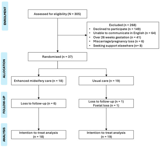 Randomisation and allocation: Randomisation procedures were successfully implemented, with 18 women randomised to the intervention group and 19 women to the usual care group. Four women in the usual care group met the clinical criteria and received the intervention. However, for ITT analysis, all participants were analysed in their originally assigned groups, preserving the benefits of randomisation. Group allocation integrity was otherwise maintained throughout the trial. The crossover of some control participants to the intervention highlights the practical feasibility of delivering flexible, responsive care and the importance of accommodating participants’ needs in real-world settings.