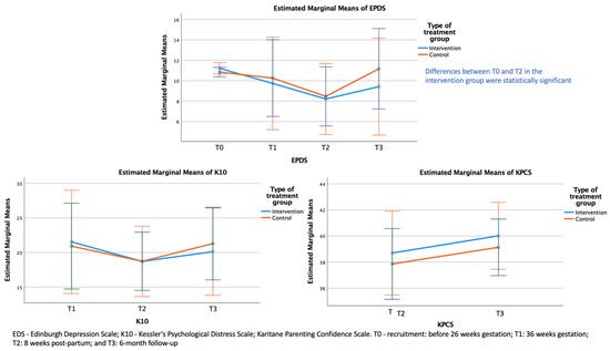 Pairwise comparisons of EDS scores across timepoints showed a significant within-group reduction in depressive symptoms from baseline (T0) to 8 weeks post-partum (T2) (Table 3).