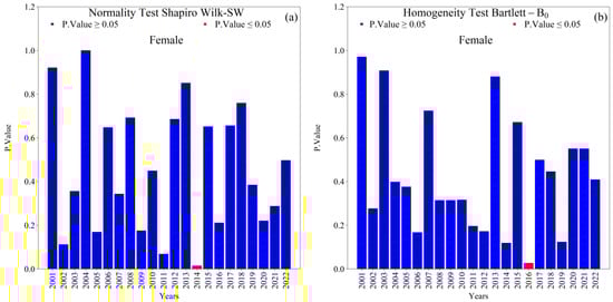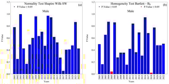 The verification of normality hypotheses ( and ) for the monthly time series of new tuberculosis (TB) cases, disaggregated by sex (male and female), was carried out using the parametric Shapiro–Wilk test [35] at a 5% significance level (), following the recommendations of [36]. This test evaluates whether the data distribution approximates a normal curve, which is crucial for determining the adequacy of parametric or nonparametric analyses.