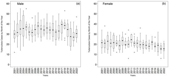Following these preliminary tests, a comprehensive descriptive and exploratory statistical analysis was performed to characterize the temporal pattern of TB incidence within the 1st Health Region of Alagoas (1st HRA). The analysis included measures of central tendency (mean, median), dispersion (standard deviation, range, and coefficient of variation), and extreme values (minimum and maximum). In addition, boxplot visualizations were generated to graphically represent the monthly variability and outlier distribution of new TB cases by sex. This exploratory phase provided a detailed overview of the dataset’s structure, variability, and potential asymmetries, supporting the interpretation of subsequent inferential tests.