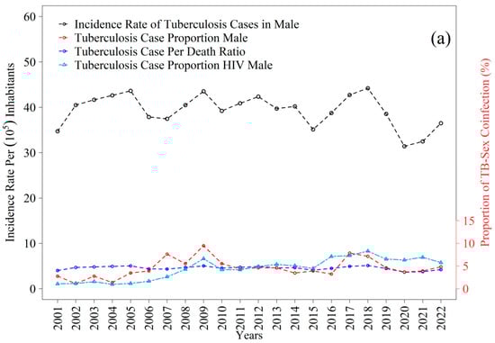 The proportion of coinfection (%TB/sex) and the incidence rate (TITB/sex) of TB cases were calculated annually in this study, following the methodology established by the Department of Epidemiological Surveillance of the Brazilian Ministry of Health (MS). These indicators were derived based on the total number of new TB cases and their distribution by sex. The calculations were expressed through Equations (S1) and (S2) as follows. Equation (S1) provides the formal expression for estimating the proportion of tuberculosis cases by sex (%TB/sex). Subsequently, the sex-specific tuberculosis incidence rates (TITB/sex) were calculated according to Equation (S2).