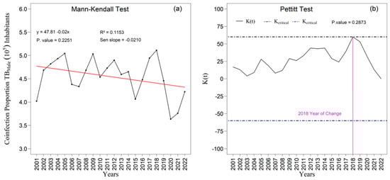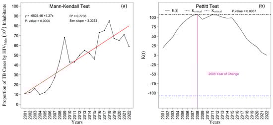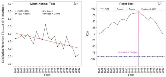 The second stage focused on identifying monotonic temporal trends and abrupt structural changes in tuberculosis incidence, disaggregated by sex. For this purpose, the nonparametric Mann–Kendall test was applied, given its robustness in detecting consistent increasing or decreasing trends in time series that do not satisfy assumptions of normality or linearity [25,26]. This test is widely recognized in environmental and health sciences for its capacity to accommodate long-term, irregular, and heterogeneous data, conditions frequently observed in surveillance systems characterized by underreporting or policy-driven discontinuities [8].
