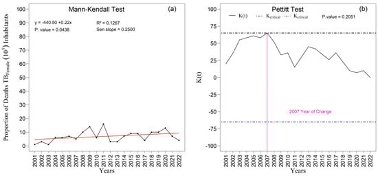 Robust statistical methods are essential for elucidating the temporal evolution of tuberculosis. Among these, the Mann–Kendall test is widely used to detect monotonic trends in time series, and the Pettitt test is valuable for identifying structural break points that may reflect the influence of public policies, modifications in surveillance systems, diagnostic changes, or epidemic shocks [22,23]. This study therefore examines tuberculosis morbidity and mortality in the First Health Region of Alagoas between 2001 and 2022, identifying trends and potential inflection points under the hypothesis that significant sex-based differences exist.