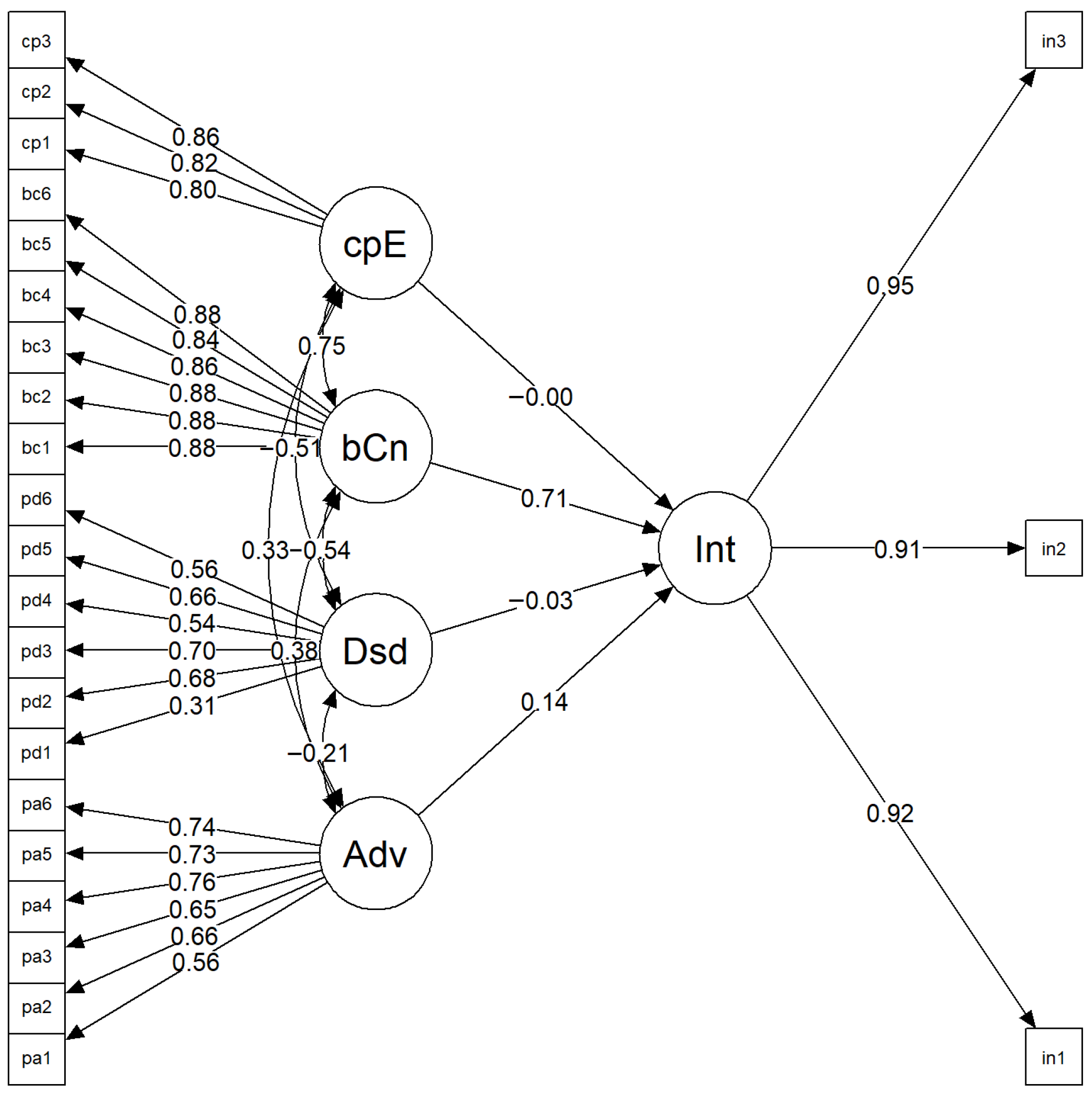 Standardized factor loadings for the latent constructs ranged from 0.31 to 0.95, indicating that the observed items contributed strongly to their respective latent variables. Regarding the structural paths, Initiation was significantly and positively predicted by Behavioral Confidence (β = 0.708, p < 0.001) and Perceived Advantage (β = 0.138, p = 0.027). In contrast, the effects of Perceived Disadvantage (β = −0.026, p = 0.625) and Changes in the Physical Environment (β = −0.001, p = 0.995) were not statistically significant.