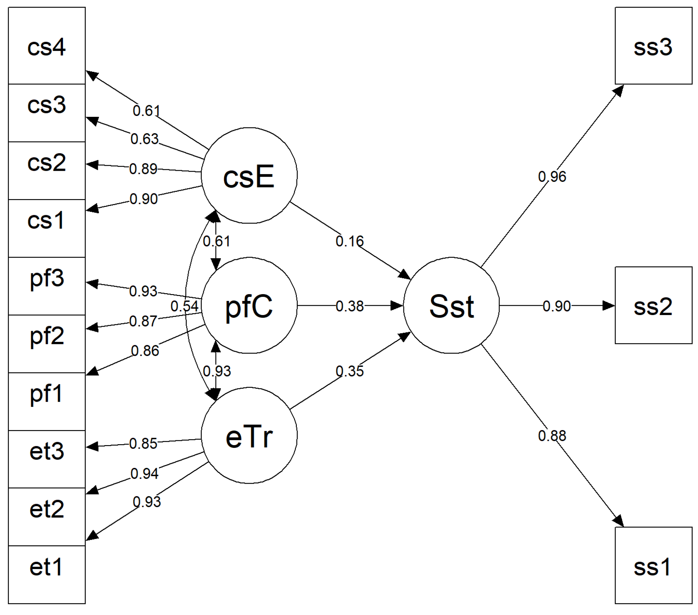 Standardized factor loadings for the latent constructs ranged from 0.61 to 0.96, indicating that the observed items contributed strongly to their respective latent variables. Regarding the structural paths, Sustenance was positively predicted by Emotional Transformation (β = 0.352, p = 0.082), Practice for Change (β = 0.380, p = 0.109), and Change in the Social Environment (β = 0.163, p = 0.085); however, these effects did not reach conventional levels of statistical significance.