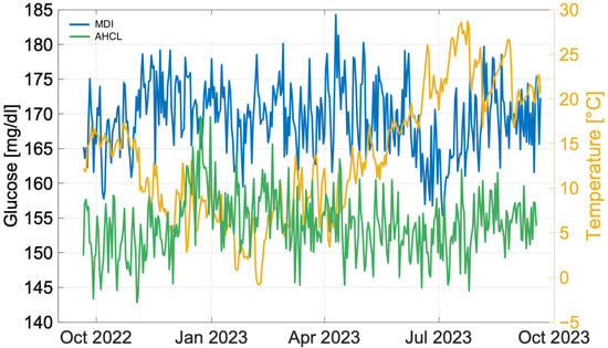 Daily mean glucose levels (both MDI and AHCL) and atmospheric temperature variations (Autumn 2022–Summer 2023). The graph combines medical data and temperature data to highlight trends and correlations over the specified period.