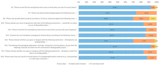 Participant assessments of clarity are detailed in Supplementary Table S1. Overall, 11/21 (52.3%) items were rated as “very clear” by over 95% of respondents. Of the 10 items exhibiting clarity problems (Figure 2), 4/14 (28.6%) concerned plastics (D2, D7, D9, D10), and 6/7 (85.7%) were related to bioplastics and other materials (D12, D13, D14, D15, D17, D18).