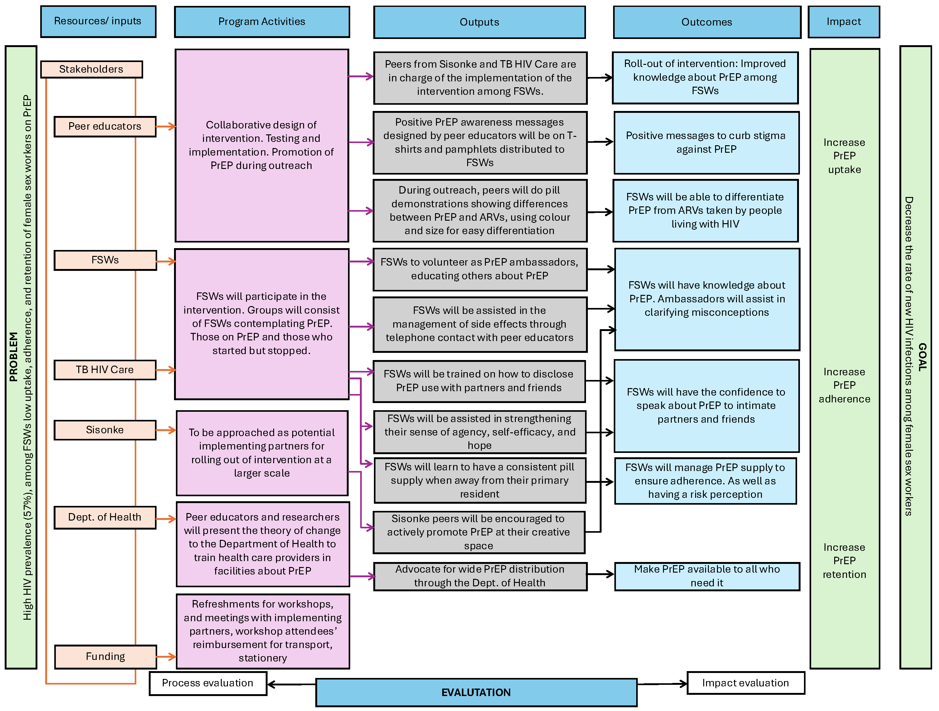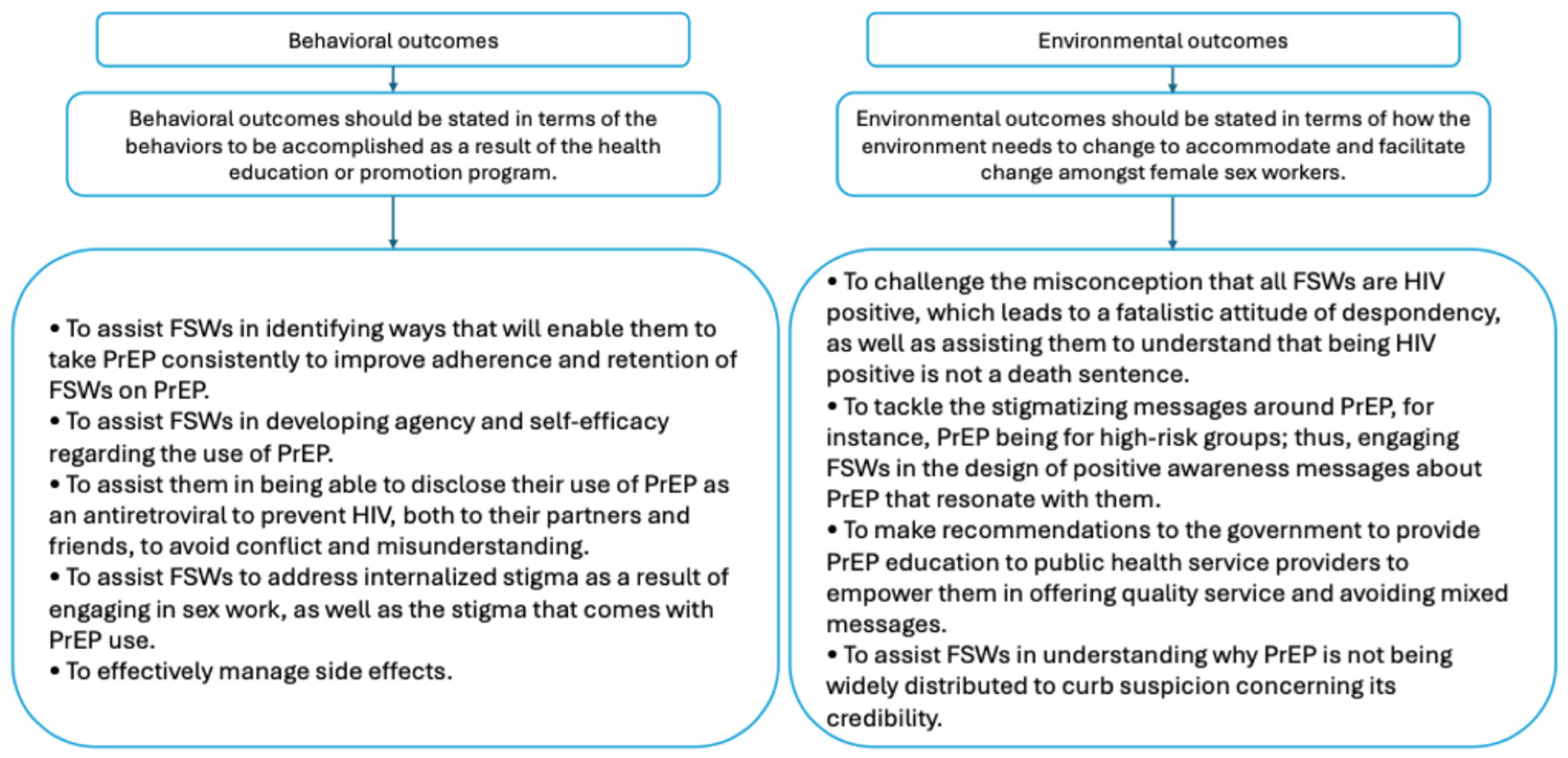 - Stigma: The objective is to destigmatize PrEP through knowledge and positive messaging. Change objectives include educating FSWs that PrEP is an antiretroviral preventing HIV transmission, using positive messages that frame PrEP as promoting sexual agency and wellness (rather than focusing on high-risk groups), and challenging predominant negative discourses around PrEP.