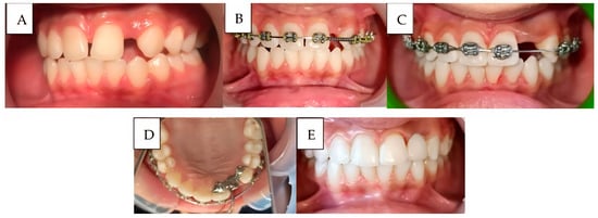 Representative clinical cases managed within the department are presented in Figure 3, Figure 4 and Figure 5, demonstrating orthodontic–prosthodontic, surgical, and regenerative approaches, respectively, with follow-ups confirming functional and aesthetic success. All case images were published with documented parental consent and anonymization.