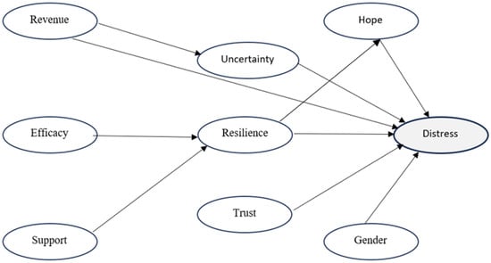 Overall, the model reveals that the impact of revenue loss on distress operates primarily through heightened uncertainty, while resilience alleviates distress mainly via its positive relationship with hope. These findings underscore the psychological mechanisms through which economic and personal resources shape entrepreneurs’ distress during crisis.