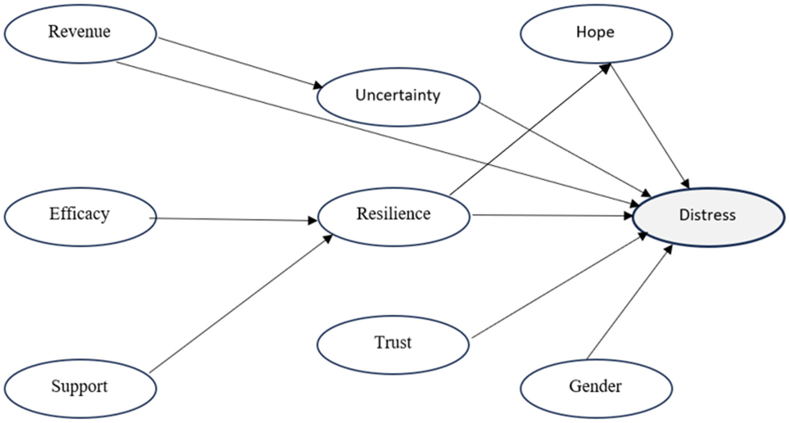The present study bridges this gap by providing one of the first empirical, multidimensional analyses of psychological distress among small business owners during a large-scale, protracted armed conflict. Grounded in the literature on entrepreneurial coping, crisis management, and psychological resources, this study examines how economic shocks (i.e., revenue loss) interact with psychological resources (resilience, support, and hope), institutional factors (trust in government), and demographic variables (gender) to shape distress levels. A key theoretical innovation of this study lies in its hierarchical modeling of entrepreneurial resilience as a higher-order construct composed of self-efficacy and social support, an approach seldom undertaken in applied resilience research. Moreover, by explicitly testing direct and indirect pathways, from economic stressors through uncertainty and psychological resources to distress, this research advances beyond prior studies on entrepreneurship in crisis contexts, which have often focused primarily on linear or isolated associations.