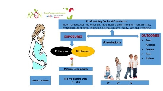 - Soomro, M.H.; Baiz, N.; Philippat, C.; Vernet, C.; Siroux, V.; Nichole Maesano, C.; Sanyal, S.; Slama, R.; Bornehag, C.G. Annesi-Maesano I: Prenatal Exposure to Phthalates and the Development of Eczema Phenotypes in Male Children: Results from the EDEN Mother-Child Cohort Study. Environ. Health Perspect. 2018, 126, 027002. [Google Scholar] [CrossRef] [PubMed]