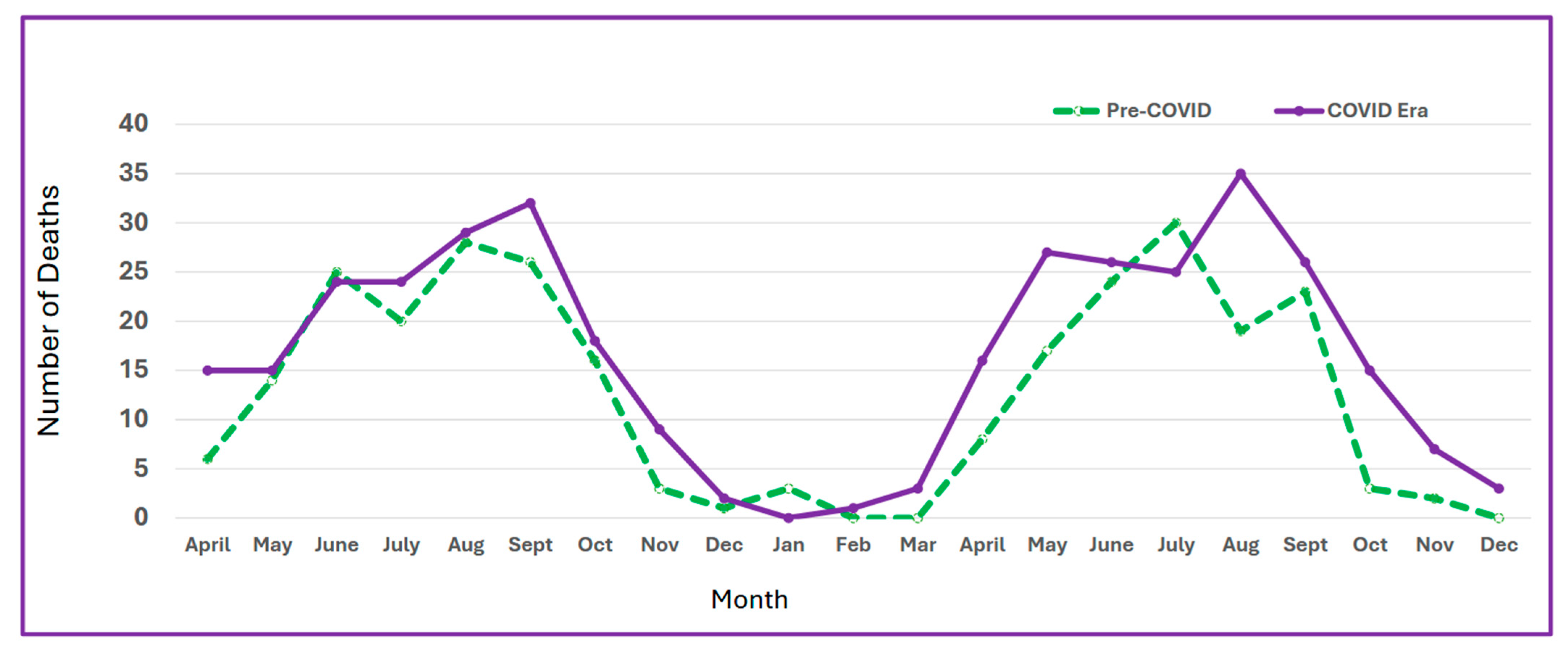 The data sources and covariates have been described elsewhere but are repeated here for the convenience of the reader [8]. The study population was categorized into two time periods. The baseline pre-COVID-19 era included fatalities occurring between 1 April 2017 and 31 December 2019 (n = 428), while the COVID-19–era included deaths between 1 April 2020 and 31 December 2022 (n = 600). A three-month buffer period was used between the pre-COVID era and the COVID era, which excluded roadway deaths from 1 January 2020–31 March 2020.