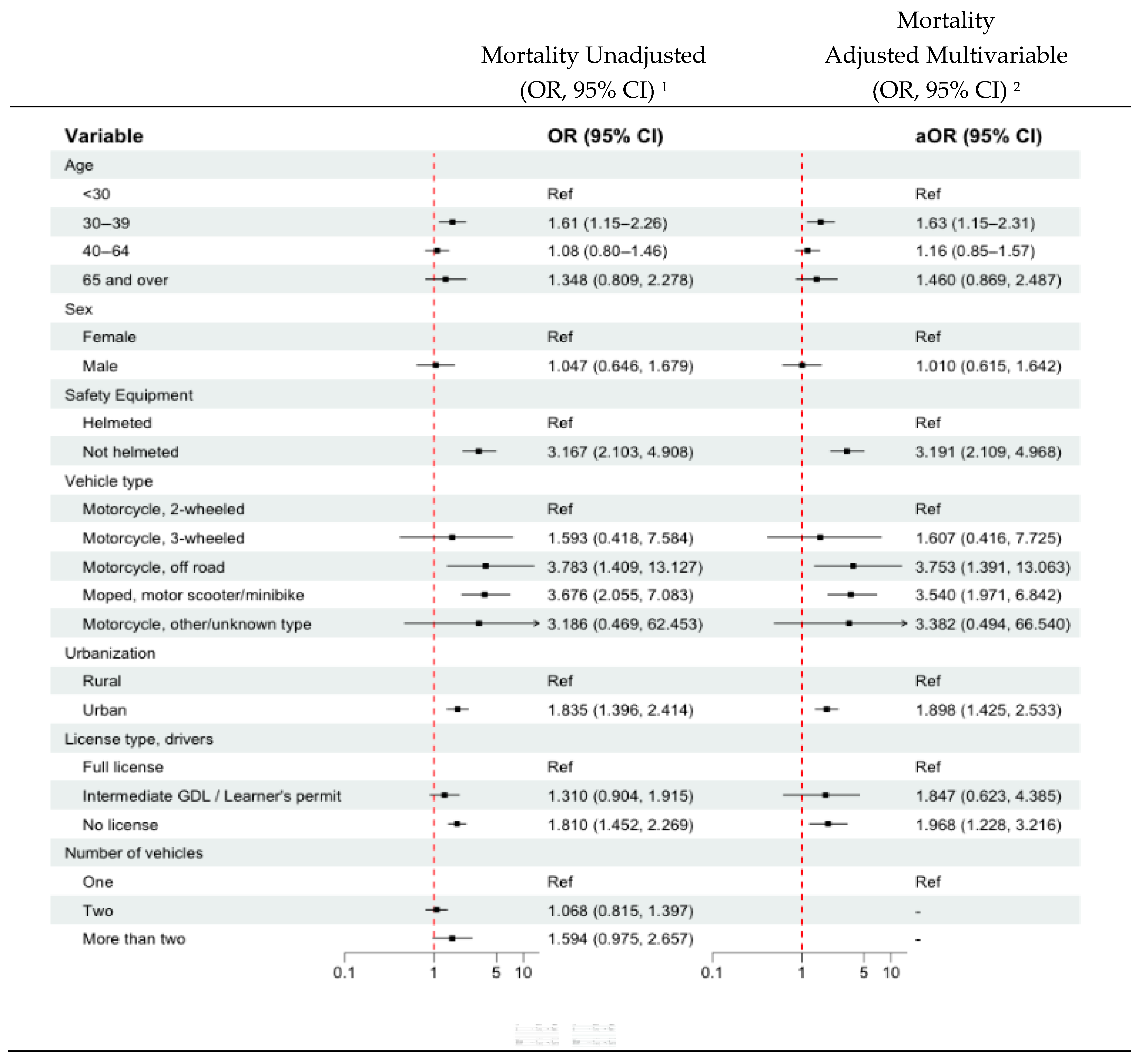 Use of protective gear. The use of a helmet was dichotomous as yes (helmeted) or no (not helmeted).