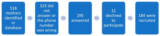 Participants were recruited from the PROTECT Center, which is composed of pregnant women and mothers of children 12 months old or younger from the North Karst Region of the archipelago of Puerto Rico. The PROTECT Center is a Superfund Research Program established in 2010 that studies the role of environmental contaminants on preterm births in Puerto Rico [16]. A total of 184 pregnant women and/or mothers from the PROTECT cohort were recruited and answered the survey virtually by phone between January 2021 and June 2022 (see Figure 1). The participants had delivered between late 2019 or during the year of 2020. Qualitative interviews were also conducted but this manuscript will focus on the quantitative survey.