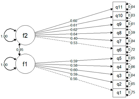Testing a two-factor model taken from Griese et al. [3], we obtained SRMR = 0.059, and RMSEA = 0.080, indicating a better fit (Figure 1). However, the CFI and TLI equal 0.895 and 0.866, respectively, remaining below the accepted thresholds of 0.9 or 0.95 (Table 3).